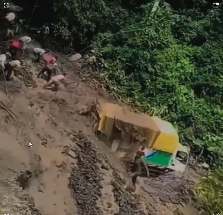 PRIMICIA.- Transportistas y pobladores solidarios trabajan incansablemente, tratando de evitar que el vehículo caiga al barranco. Sucedió en un riachuelo...