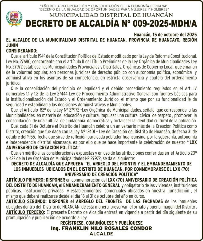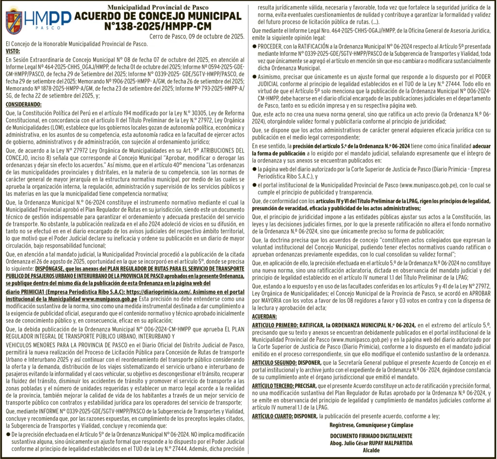 RESOLUCIÓN / ACUERDO / DECRETO MUNICIPAL ACUERDO DE CONCEJO MUNICIPAL / DECRETO DE ALCALDÍA – JUEVES 16/OCT/2025 16 de octubre de 2025 MUNICIPALIDAD DISTRITAL DE HUANCÁNDECRETO DE ALCALDÍA N° 009-2025-MDH/AMUNICIPALIDAD PROVINCIAL DE PASCOACUERDO DE CONCEJO MUNICIPAL N°138-2025/HMPP-CMPost navigationAnterior PETITORIO MINERO PASCO – JUEVES 16/OCT/2025Próximo RECTIFICACIÓN DE PARTIDA – JUEVES 16/OCT/2025