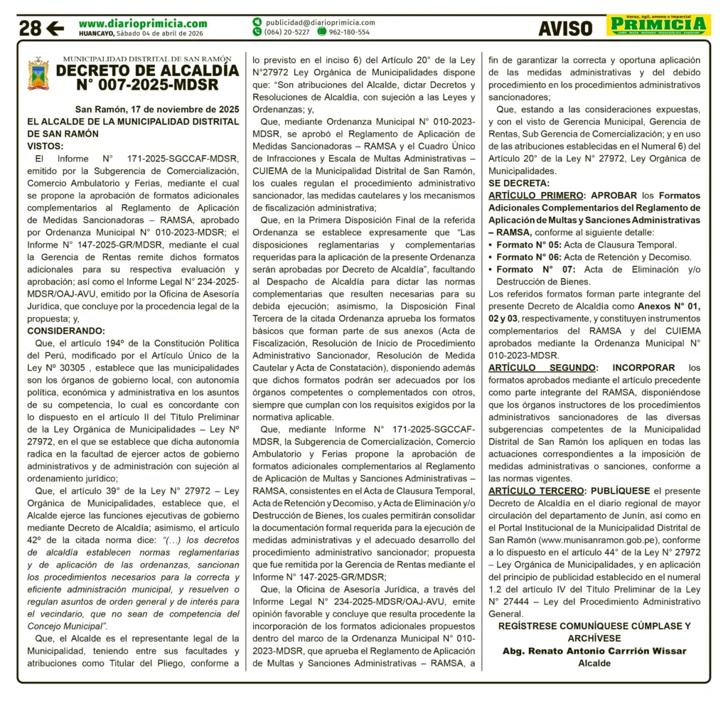 JUNIN RESOLUCIÓN / ACUERDO / DECRETO MUNICIPAL DECRETO DE ALCALDÍA – SÁBADO 04/ABR/2026 sábado, 4 de abril de 2026 | 6:56 AM MUNICIPALIDAD DISTRITAL DE SAN RAMÓNDECRETO DE ALCALDÍA N° 007-2025-MDSRNavegación de entradasAnterior FISCALÍA REALIZÓ OPERATIVOS A DIVERSAS AGENCIAS DE TRANSPORTES EN HUÁNUCOSiguiente MÁS DE 60 000 PLANTONES Y 3 TONELADAS DE SEMILLAS REACTIVARÁN EL AGRO