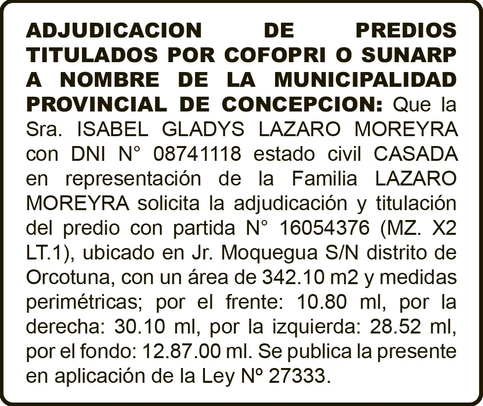 ADJUDICACIONES JUNIN ADJUDICACIONES – LUNES 06/OCT/2025 6 de octubre de 2025 ADJUDICACIONESADJUDICACIÓN DE PREDIOS TITULADOS POR COFOPRI O SUNARP A NOMBRE DE LA MUNICIPALIDAD PROVINCIAL DE CONCEPCIÓNPARTIDA N° 16054376Post navigationAnterior MAL EJEMPLO: EN FÚTBOL MENORES AGREDEN A ÁRBITROPróximo DISOLUCIÓN / LIQUIDACIÓN / TRANSFORMACIÓN – LUNES 06/OCT/2025