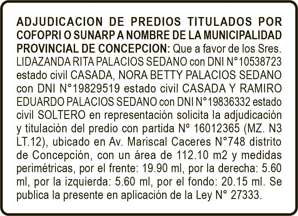 ADJUDICACIONES JUNIN ADJUDICACIONES – LUNES 15/DIC/2025 15 de diciembre de 2025 ADJUDICACIONESADJUDICACIÓN DE PREDIOS TITULADOS POR COFOPRI O SUNARP A NOMBRE DE LA MUNICIPALIDAD PROVINCIAL DE CONCEPCIÓNPARTIDA N° 16012365Post navigationAnterior NOTIFICACIÓN DE PRETENSIÓN – LUNES 15/DIC/2025Próximo RECTIFICACIÓN DE PARTIDA – LUNES 15/DIC/2025
