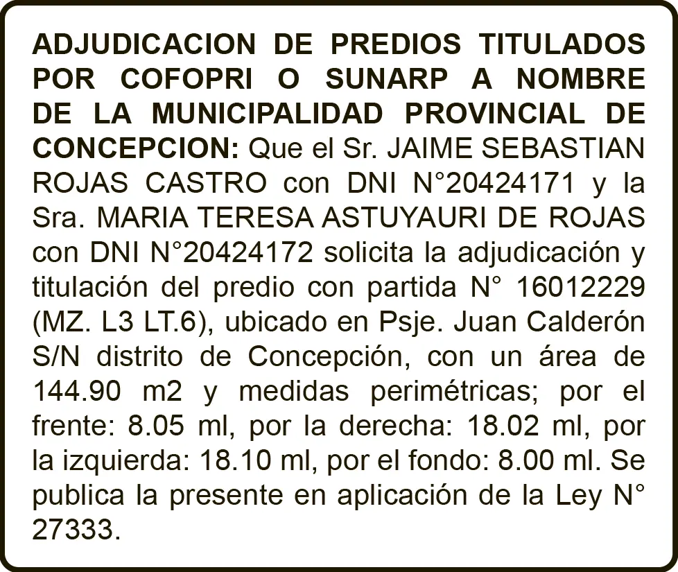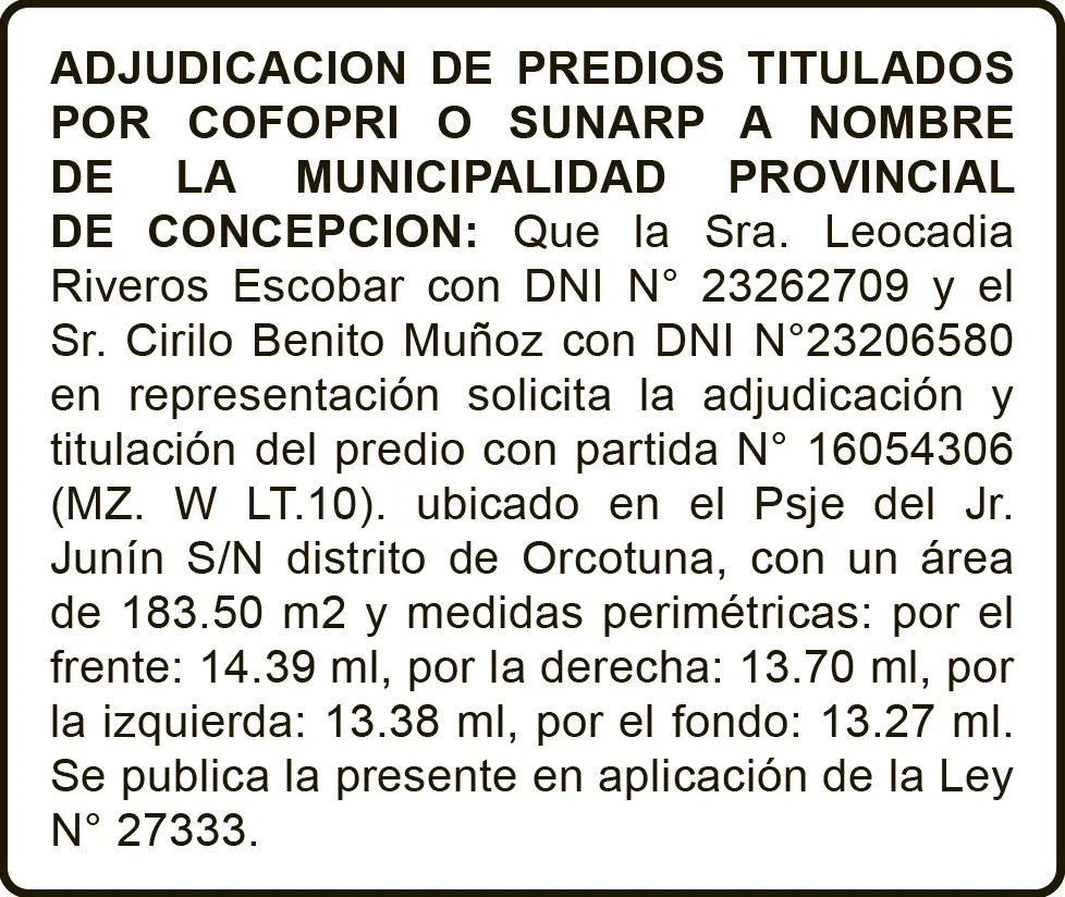 ADJUDICACIÓN DE PREDIOS TITULADOS POR COFOPRI O SUNARP A NOMBRE DE LA MUNICIPALIDAD PROVINCIAL DE CONCEPCIÓN