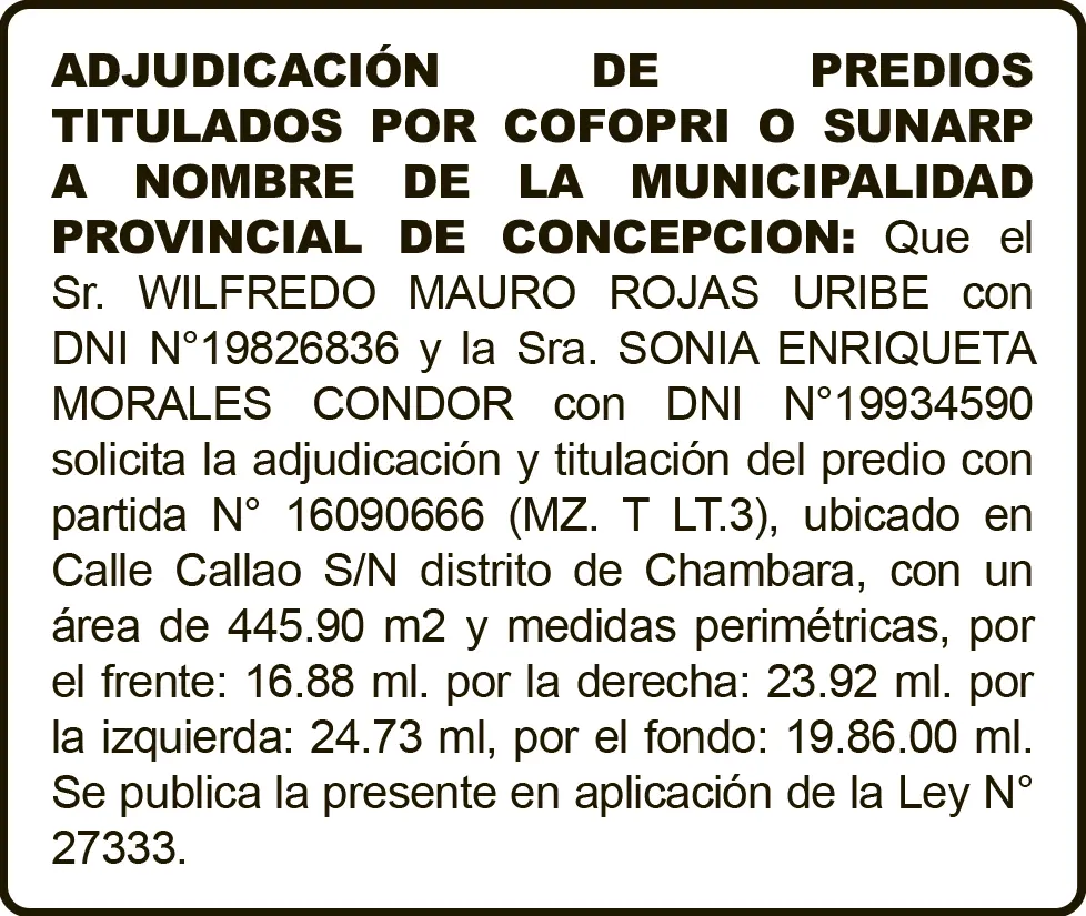 ADJUDICACIONES JUNIN ADJUDICACIONES – MARTES 14/OCT/2025 14 de octubre de 2025 ADJUDICACIONESADJUDICACIÓN DE PREDIOS TITULADOS POR COFOPRI O SUNARP A NOMBRE DE LA MUNICIPALIDAD PROVINCIAL DE CONCEPCIÓNPARTIDA N° 16090666Post navigationAnterior VÍA HUANCAYO-HUANCAVELICA: VEHÍCULO VUELCA Y QUEDA EN LA CUNETAPróximo EDICTO JUDICIAL HUANCAVELICA – MARTES 14/OCT/2025