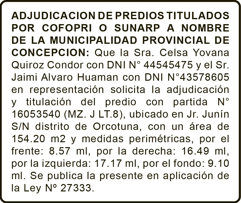 ADJUDICACIONES JUNIN ADJUDICACIONES – MARTES 21/OCT/2025 1 min read 21 de octubre de 2025 ADJUDICACIONESADJUDICACIÓN DE PREDIOS TITULADOS POR COFOPRI O SUNARP A NOMBRE DE LA MUNICIPALIDAD PROVINCIAL DE CONCEPCIÓNPARTIDA N° 16053540Continue ReadingPrevious PERDIDA DE DOCUMENTOS – MARTES 21/OCT/2025Next PETITORIO MINERO HUANCAVELICA – MARTES 21/OCT/2025