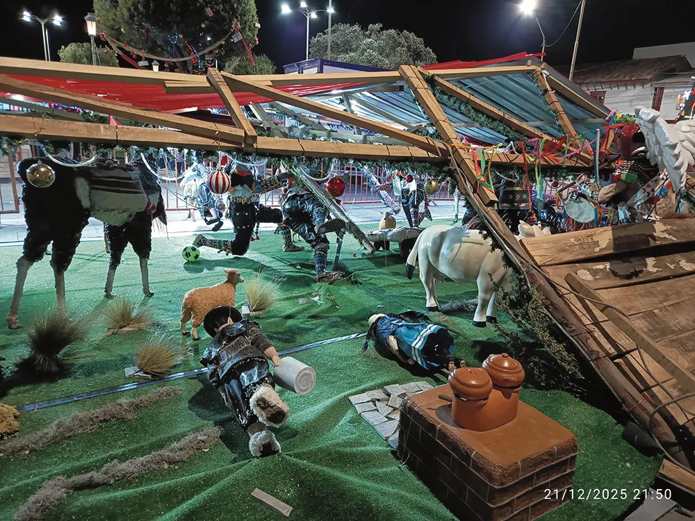 PRIMICIA.- El Nacimiento Chopcca, instalado en la Plaza de Armas de Huancavelica, sufrió daños la noche del domingo luego de que parte del techo que lo cubría se cayera, generando preocupación entre vecinos y transeúntes.
