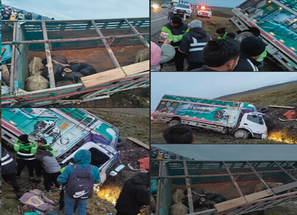 PRIMICIA.- Un grave accidente se registró la madrugada del último sábado en la región Pasco, cuando un camión de carga pesada que transportaba catorce toros se despistó y terminó volcado en una zanja, dejando como saldo dos personas heridas y a los animales con diversas lesiones.