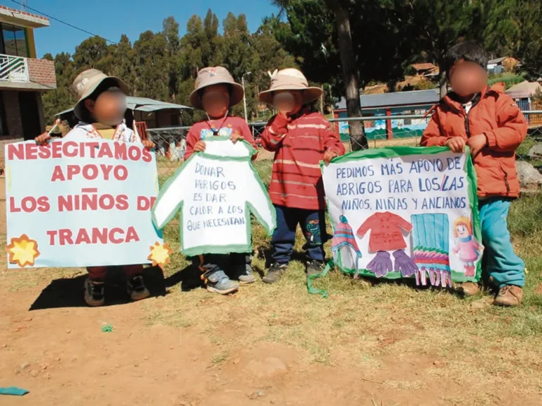 A más de 3 500 m.s.n.m., menores con pancarta en mano piden abrigo y apoyo del Estado. PRIMICIA. - Soportando...