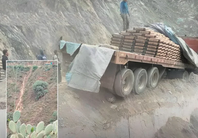 PRIMICIA.- Un camión cargado de cemento se salvó de caer a un abismo de cerca de 100 metros, entre los...