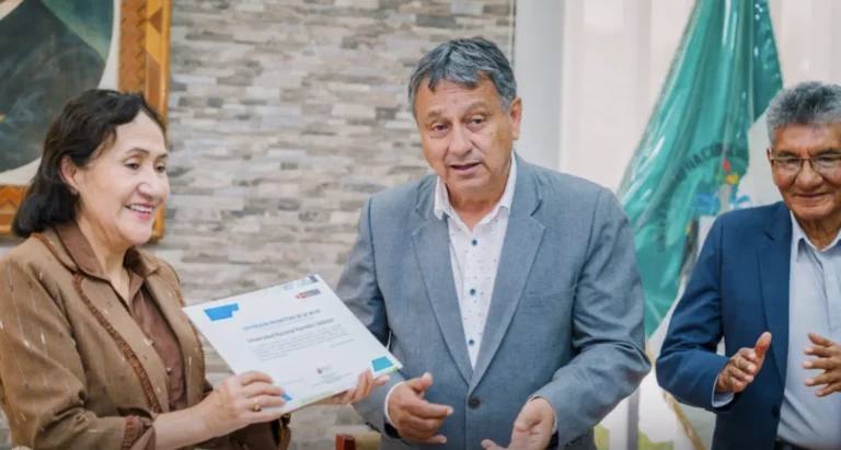 PRIMICIA.- El Vicerrector de Investigación, Dr. Víctor Cuadros Ojeda, hizo entrega oficial al Rector, Dr. Guillermo Bocangel Weydert, la Certificación...
