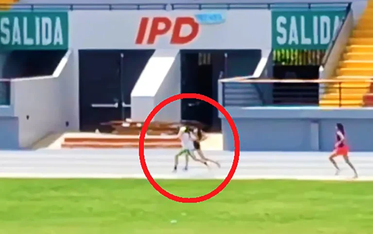 PRIMICIA.- La polémica carrera de 600 metros entre las representantes de Huánuco y Junín, donde se observa a la escolar...