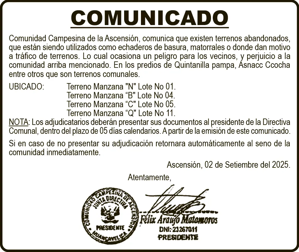 COMUNICADOS HUANCAVELICA JUNIN PASCO COMUNICADO – JUEVES 04/SET/2025 1 min read 4 de septiembre de 2025 COMUNICADOCOMUNIDAD CAMPESINA DE LA ASCENSIÓNCOMUNICADOCORTE SUPERIOR DE JUSTICIA DE PASCOJUZGADO DE FAMILIA PERMANENTE ITINERANTECOMUNICADOSUNASSSUPERINTENDENCIA NACIONAL DE SERVICIOS DE SANEAMIENTOMETAS DE GESTIÓN PARA EMSAPA YAULI-LA OROYA S.R.L.Continue ReadingPrevious EDICTO MATRIMONIAL – JUEVES 04/SET/2025Next NOTIFICACIÓN DE PRETENSIÓN – JUEVES 04/SET/2025