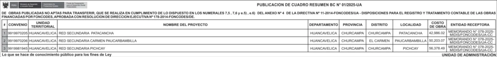 COMUNICADOS HUANCAVELICA COMUNICADO – MIÉRCOLES 24/SET/2025 1 min read 24 de septiembre de 2025 COMUNICADOFONCODESPUBLICACIÓN DE CUADRO RESUMEN BC N° 01/2025-UA DE OBRAS PUBLICADAS NO APTAS PARA TRANSFERIRContinue ReadingPrevious SANEAMIENTO FÍSICO LEGAL – MIÉRCOLES 24/SET/2025Next ¡SE LE HIZO JUSTICIA! RECONOCEN A ATLETA ESCOLAR DE JUNÍN COMO LA GANADORA EN LOS 600 METROS