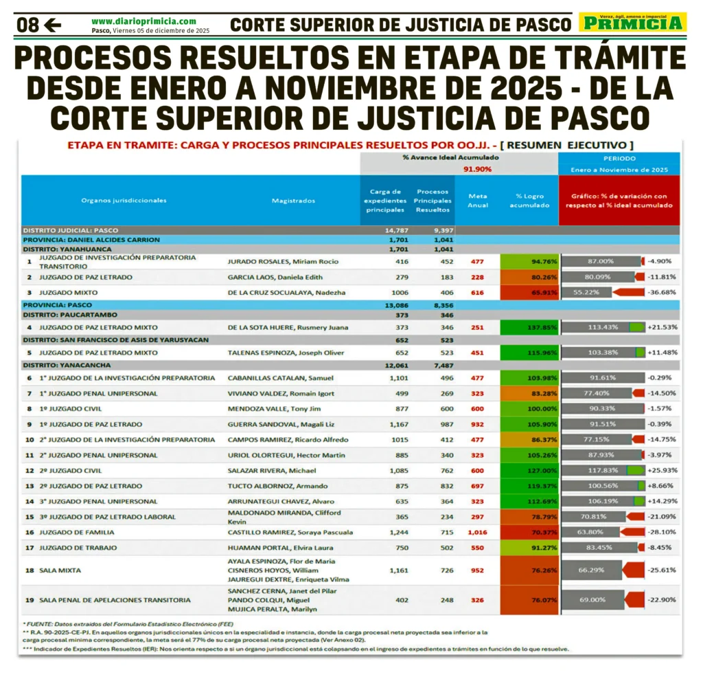 COMUNICADOS PASCO COMUNICADO – VIERNES 05/DIC/2025 5 de diciembre de 2025 CORTE SUPERIOR DE JUSTICIA DE PASCOPROCESOS RESUELTOS EN ETAPA DE TRÁMITE DESDE ENERO A NOVIEMBRE DE 2025 – DE LA CORTE SUPERIOR DE JUSTICIA DE PASCOPost navigationAnterior CONVOCATORIAS – VIERNES 05/DIC/2025Próximo DIRCETUR HUÁNUCO: REALIZAN I CURSO DE FORMACIÓN INTEGRAN DE ARRIEROS DE LA CORDILLERA HUAYHUASH