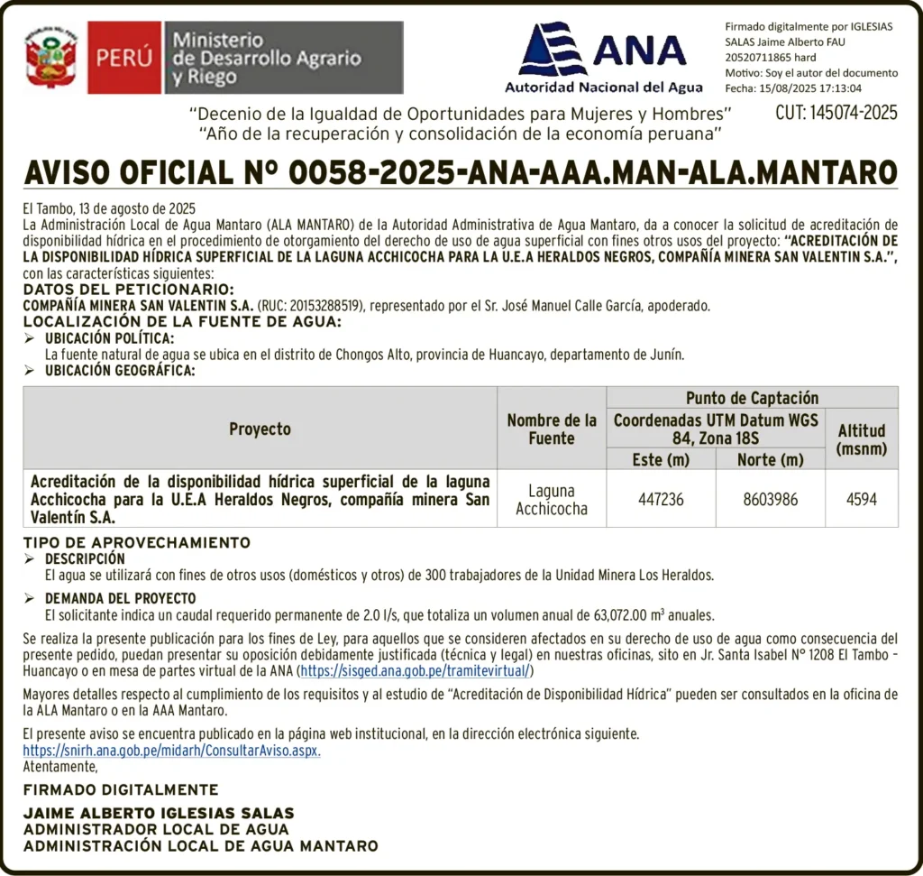 COMUNICADOS COMUNICADO – VIERNES 05/SET/2025 1 min read 5 de septiembre de 2025 AUTORIDAD NACIONAL DEL AGUA (ANA)AVISO OFICIAL N° 0058-2025-ANA-AAA.MAN-ALA.MANTAROCUT: 145074-2025Continue ReadingPrevious EDICTO MATRIMONIAL – VIERNES 05/SET/2025Next PETITORIO MINERO HUANCAVELICA – VIERNES 05/SET/2025