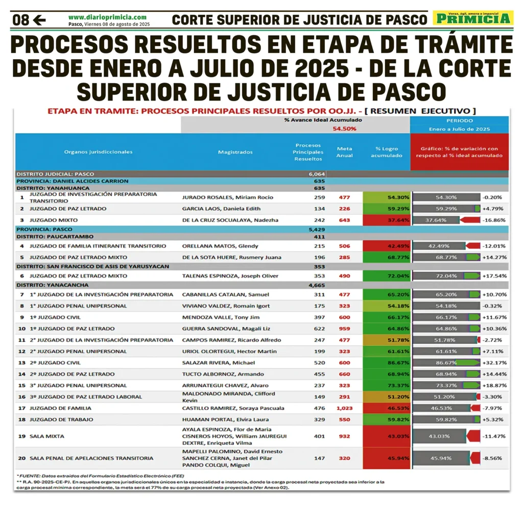 COMUNICADOS PASCO COMUNICADO – VIERNES 08/AGO/2025 viernes, 8 de agosto de 2025 | 1:40 AM CORTE SUPERIOR DE JUSTICIA DE PASCOPROCESOS RESUELTOS EN ETAPA DE TRÁMITE DESDE ENERO A JULIO DE 2025 – DE LA CORTE SUPERIOR DE JUSTICIA DE PASCOPost navigationAnterior PETITORIO MINERO PASCO – VIERNES 08/AGO/2025Próximo COPA PERÚ DEPARTAMENTAL JUNÍN EN SU SEGUNDA FECHA