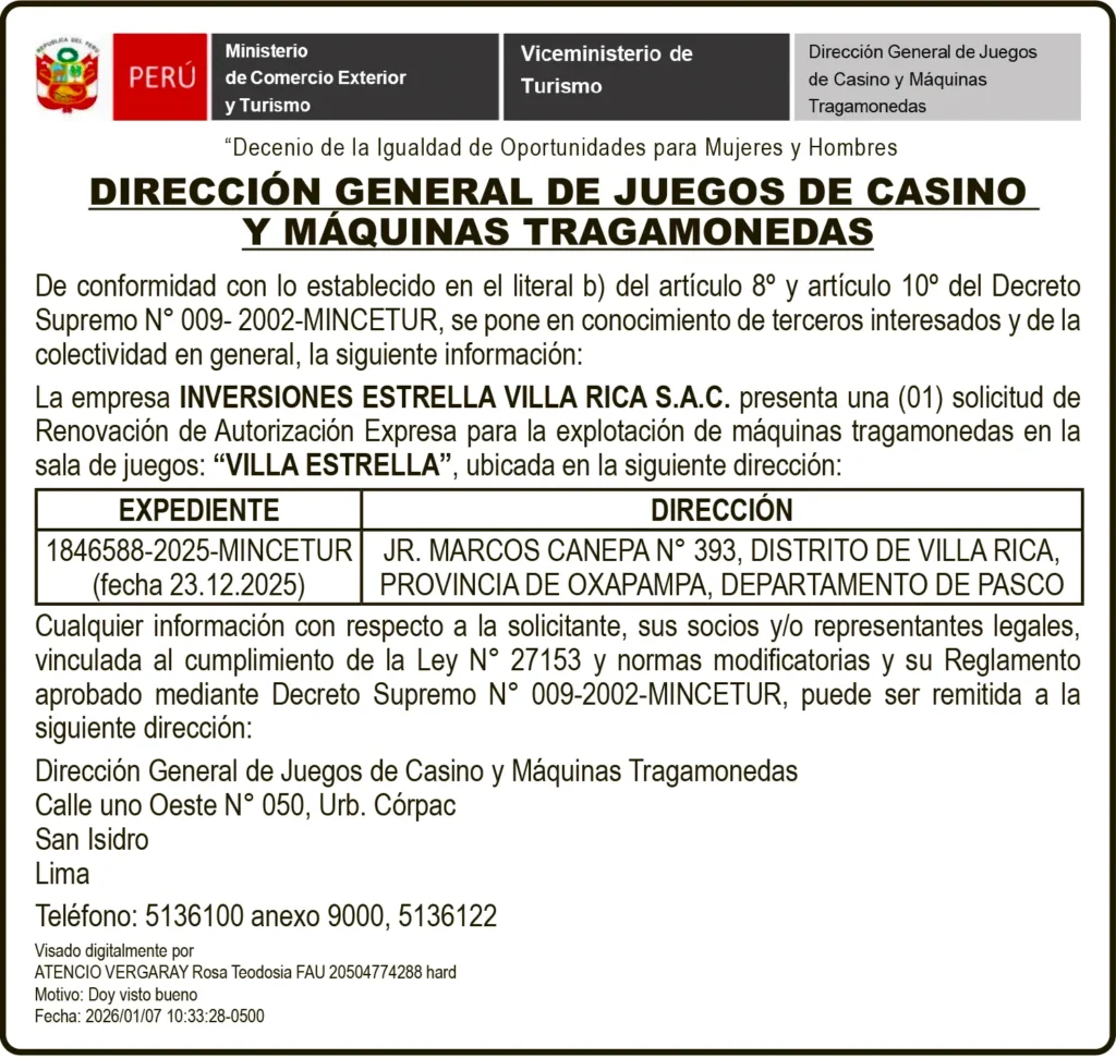 COMUNICADOS PASCO COMUNICADO – VIERNES 09/ENE/2025 viernes, 9 de enero de 2026 | 6:41 AM DIRECCIÓN GENERAL DE JUEGOS DE CASINO Y MÁQUINAS TRAGAMONEDASSE PONE EN CONOCIMIENTORENOVACIÓN DE AUTORIZACIÓN EXPRESAINVERSIONES ESTRALLA VILLA RICA S.A.C.EXPEDIENTE 1846588-2025-MINCETURPost navigationAnterior EDICTO JUDICIAL HUANCAVELICA – VIERNES 09/ENE/2026Próximo CHAVÍN DE PARIARCA: RECUPERAN MOTOCICLETA CON REQUISITORIA VIGENTE