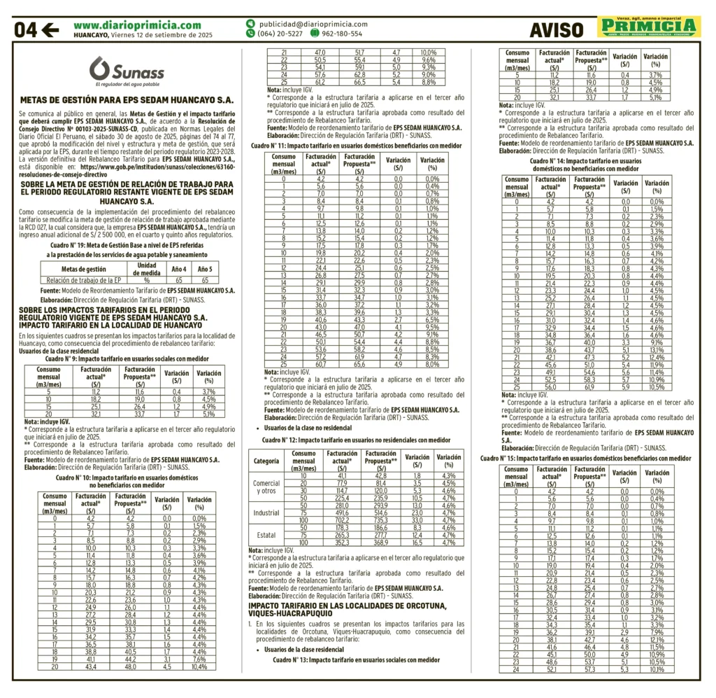 METAS DE GESTIÓN PARA EPS SEDAM HUANCAYO S.A.