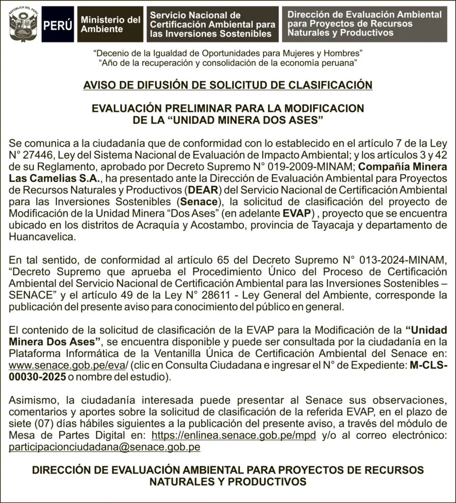 COMUNICADOS COMUNICADO – VIERNES 14/MAR/2025 14 de marzo de 2025 DIRECCIÓN DE EVALUACIÓN AMBIENTAL PARA PROYECTOS DE RECURSOS NATURALES Y PRODUCTIVOSAVISO DE DIFUSIÓN DE SOLICITUD DE CLASIFICACIÓNEVALUACIÓN PRELIMINAR PARA LA MODIFICACIÓN DE LA «UNIDAD MINERA DOS ASES»Post navigationAnterior EDICTO JUDICIAL HUANCAVELICA – VIERNES 14/MAR/2025Próximo EDICTO MATRIMONIAL – VIERNES 14/MAR/2025