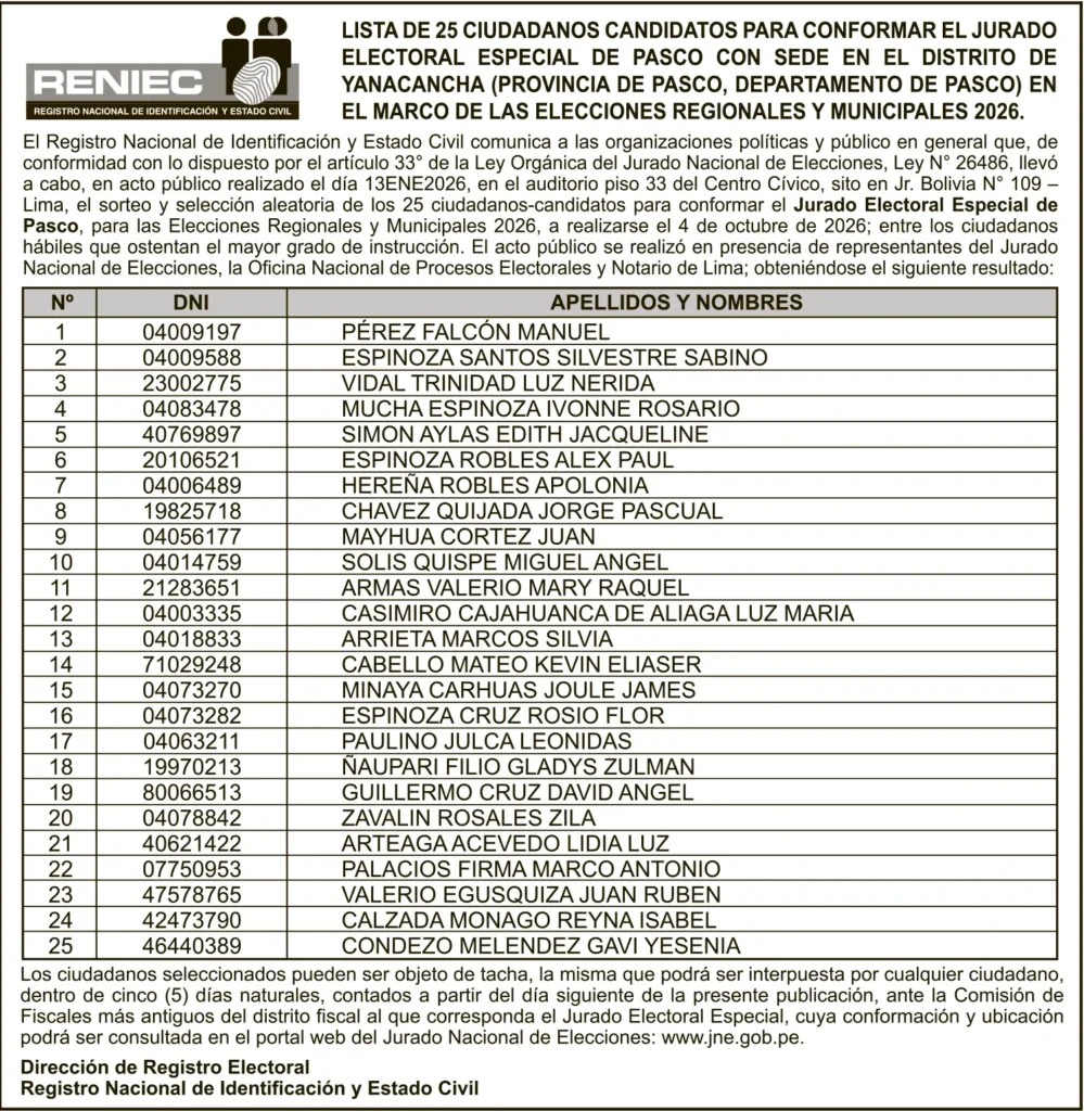 LISTA DE 25 CIUDADANOS CANDIDATOS PARA CONFORMAR EL JURADO ELECTORAL ESPECIAL DE PASCO CON SEDE EN EL DISTRITO DE YANACANCHA (PROVINCIA DE PASCO, DEPARTAMENTO DE PASCO) EN EL MARCO DE LAS ELECCIONES REGIONALES Y MUNICIPALES 2026