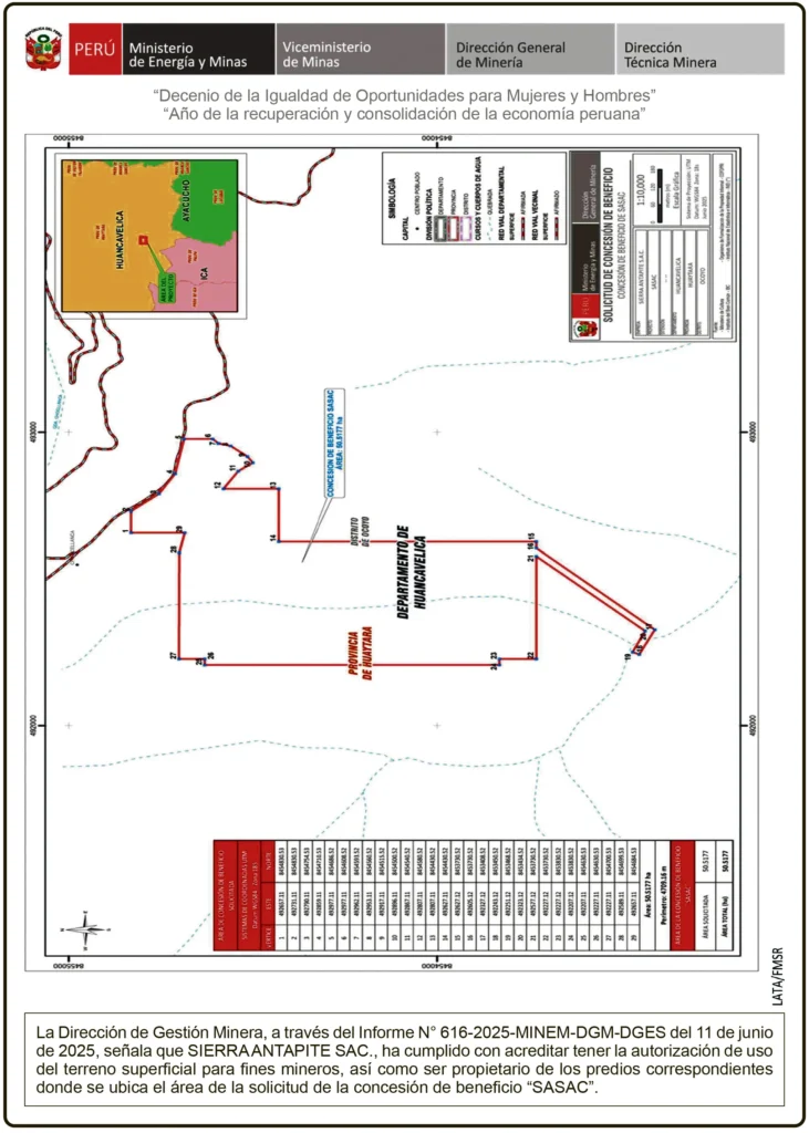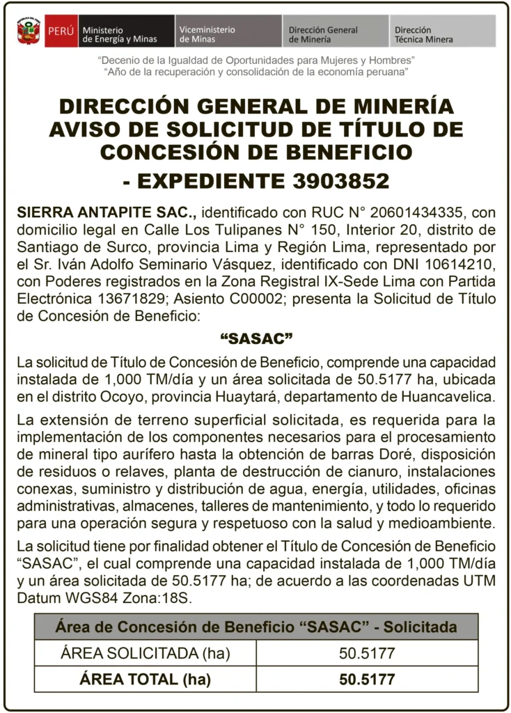 CONCESIÓN DE BENEFICIO - HUANCAVELICA CONCESIÓN DE BENEFICIO HUANCAVELICA – SÁBADO 28/JUN/2025 28 de junio de 2025 DIRECCIÓN GENERAL DE MINERÍAAVISO DE SOLICITUD DE TÍTULO DE CONCESIÓN DE BENEFICIOEXPEDIENTE 3903852Post navigationAnterior RECTIFICACIÓN DE PARTIDA – SÁBADO 28/JUN/2025Próximo LEÓN DE HUÁNUCO DE ANIVERSARIO