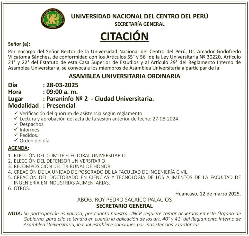 CONVOCATORIAS CONVOCATORIAS – JUEVES 13/MAR/2025 13 de marzo de 2025 CITACIÓNUNIVERSIDAD NACIONAL DEL CENTRO DEL PERÚSECRETARÍA GENERALASAMBLEA UNIVERSITARIA ORDINARIADIA: 28-03-2025 / HORA: 09:00 AMPost navigationAnterior NOTIFICACIÓN DE PRETENSIÓN – JUEVES 13/MAR/2025 Próximo EN OPERATIVOS CONTRA MINERÍA ILEGAL: MÁS DE S/ 240 MILLONES EN BIENES DESTRUIDOS