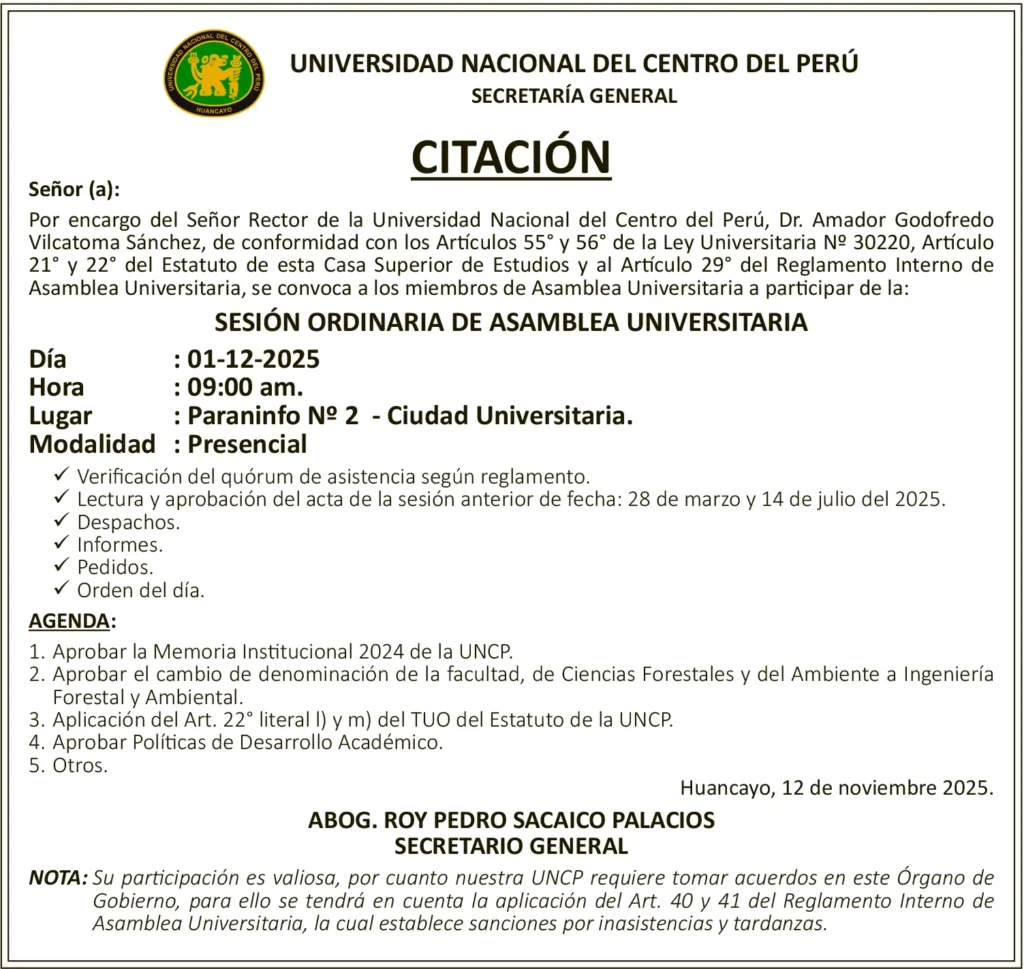CONVOCATORIAS JUNIN CONVOCATORIAS – JUEVES 13/NOV/2025 1 min read 13 de noviembre de 2025 CITACIÓNUNIVERSIDAD NACIONAL DEL CENTRO DEL PERÚSECRETARÍA GENERALSESIÓN ORDINARIA DE ASAMBLEA UNIVERSITARIADIA: 01-12-2025 / HORA: 09:00 AMContinue ReadingPrevious NOTIFICACIÓN DE PRETENSIÓN – JUEVES 13/NOV/2025Next PETITORIO MINERO PASCO – JUEVES 13/NOV/2025