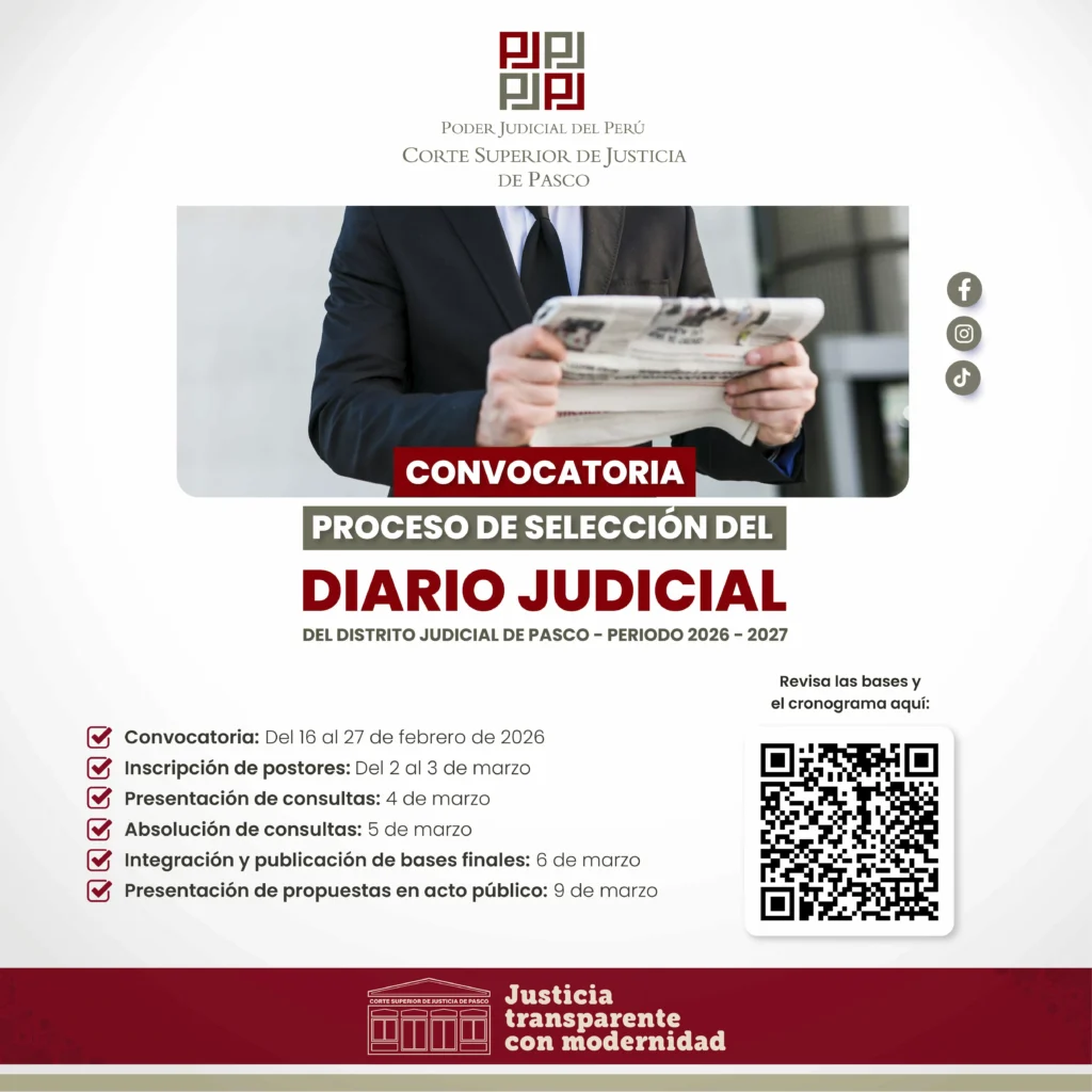 CONVOCATORIAS PASCO CONVOCATORIAS – LUNES 16/FEB/2025 lunes, 16 de febrero de 2026 | 7:56 PM CONVOCATORIAPROCESO DE SELECCION DEL DIARIO JUDICIALDEL DISTRITO JUDICIAL DE PASCO – PERIODO 2026 – 2027Post navigationAnterior HUAYTARÁ: BUS VARADO POR FALTA DE LLANTA DE REPUESTO