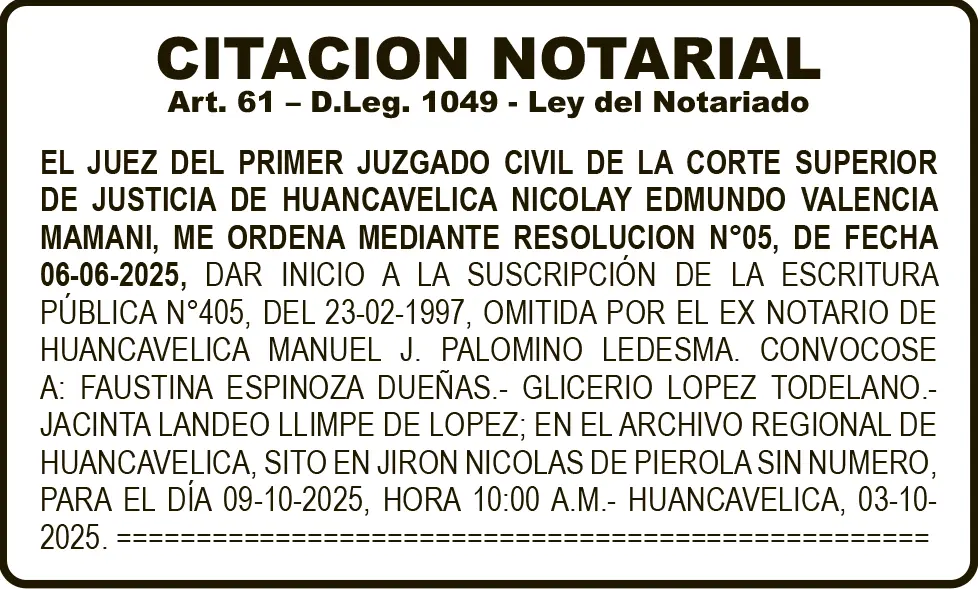 CONVOCATORIAS HUANCAVELICA CONVOCATORIAS – MARTES 07/OCT/2025 7 de octubre de 2025 CITACIÓN NOTARIALJUEZ DEL PRIMER JUZGADO CIVIL DE LA CORTE SUPERIOR DE JUSTICIA DE HUANCAVELICAPost navigationAnterior PETITORIO MINERO HUANCAVELICA – MARTES 07/OCT/2025Próximo GLORIAS DEL BÁSQUETBOL EN EL “COUNTRY CLUB”
