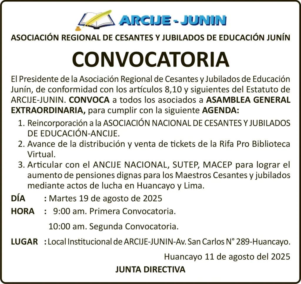 CONVOCATORIAS JUNIN CONVOCATORIAS – MARTES 12/AGO/2025 12 de agosto de 2025 CONVOCATORIAARCIJE – JUNÍNASOCIACIÓN REGIONAL DE CESANTES Y JUBILADOS DE EDUCACIÓN JUNÍNPost navigationAnterior SANEAMIENTO FÍSICO LEGAL – MARTES 12/AGO/2025Próximo EDICTO JUDICIAL HUANCAVELICA – MARTES 12/AGO/2025