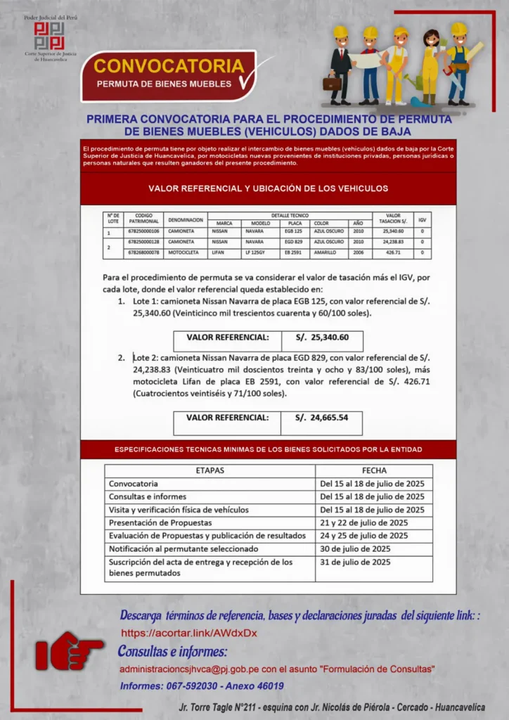 CONVOCATORIAS HUANCAVELICA CONVOCATORIAS – MIÉRCOLES 16/JUL/2025 16 de julio de 2025 CORTE SUPERIOR DE JUSTICIA DE HUANCAVELICACONVOCATORIAPERMUTA DE BIENES MUEBLESPRIMERA CONVOCATORIA PARA EL PROCEDIMIENTO DE PERMUTA DE BIENES MUEBLES (VEHICULOS) DADOS DE BAJAPost navigationAnterior ORDENANZA MUNICIPAL – MIÉRCOLES 16/JUL/2025Próximo SPORT HUANCAYO DE VISITA CON ALIANZA ATLÉTICO DE SULLANA