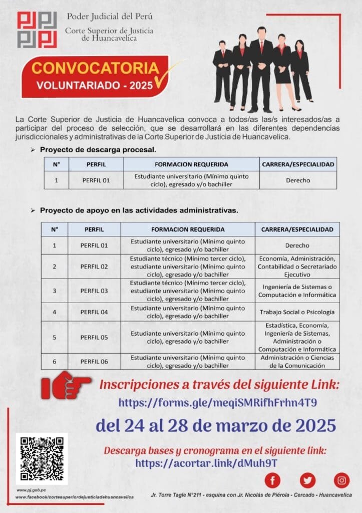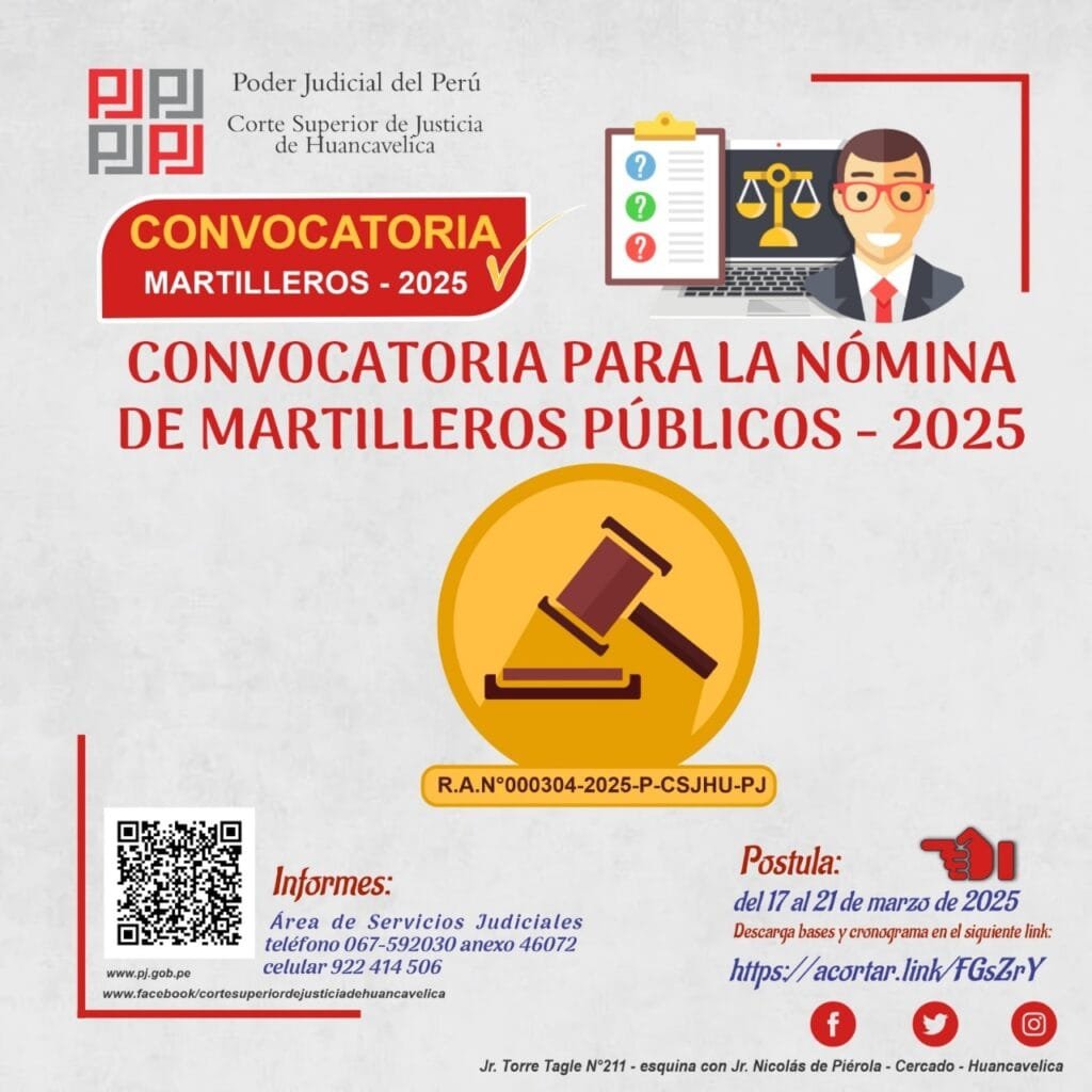 CONVOCATORIAS CONVOCATORIAS – MIÉRCOLES 19/MAR/2025 miércoles, 19 de marzo de 2025 | 1:25 AM CONVOCATORIACORTE SUPERIOR DE JUSTICIA DE HUANCAVELICAMARTILLEROS – 2025CONVOCATORIACORTE SUPERIOR DE JUSTICIA DE HUANCAVELICAVOLUNTARIADO – 2025Post navigationAnterior RECTIFICACIÓN DE PARTIDA – MIÉRCOLES 19/MAR/2025Próximo NOTIFICACIÓN POR EDICTO – MIÉRCOLES 19/MAR/2025