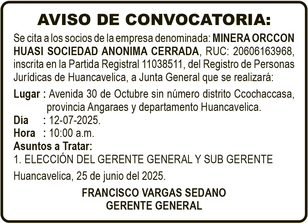 CONVOCATORIAS CONVOCATORIAS – MIÉRCOLES 25/JUN/2025 25 de junio de 2025 AVISO DE CONVOCATORIAMINERA ORCCON HUASI SOCIEDAD ANONIMA CERRADARUC: 20606163968Post navigationAnterior ALQUILER DE INMUEBLES – MIÉRCOLES 25/JUN/2025Próximo ACUERDO DE CONCEJO – MIÉRCOLES 25/JUN/2025