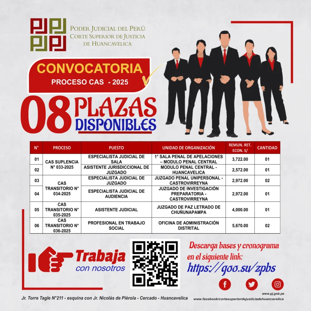 CONVOCATORIAS HUANCAVELICA CONVOCATORIAS – MIÉRCOLES 29/OCT/2025 1 min read 29 de octubre de 2025 CORTE SUPERIOR DE JUSTICIA DE HUANCAVELICACONVOCATORIAPROCESO CAS N° – 202508 PLAZAS DISPONIBLESContinue ReadingPrevious RECTIFICACIÓN DE PARTIDA – MIÉRCOLES 29/OCT/2025Next EDICTO JUDICIAL HUANCAVELICA – MIÉRCOLES 29/OCT/2025