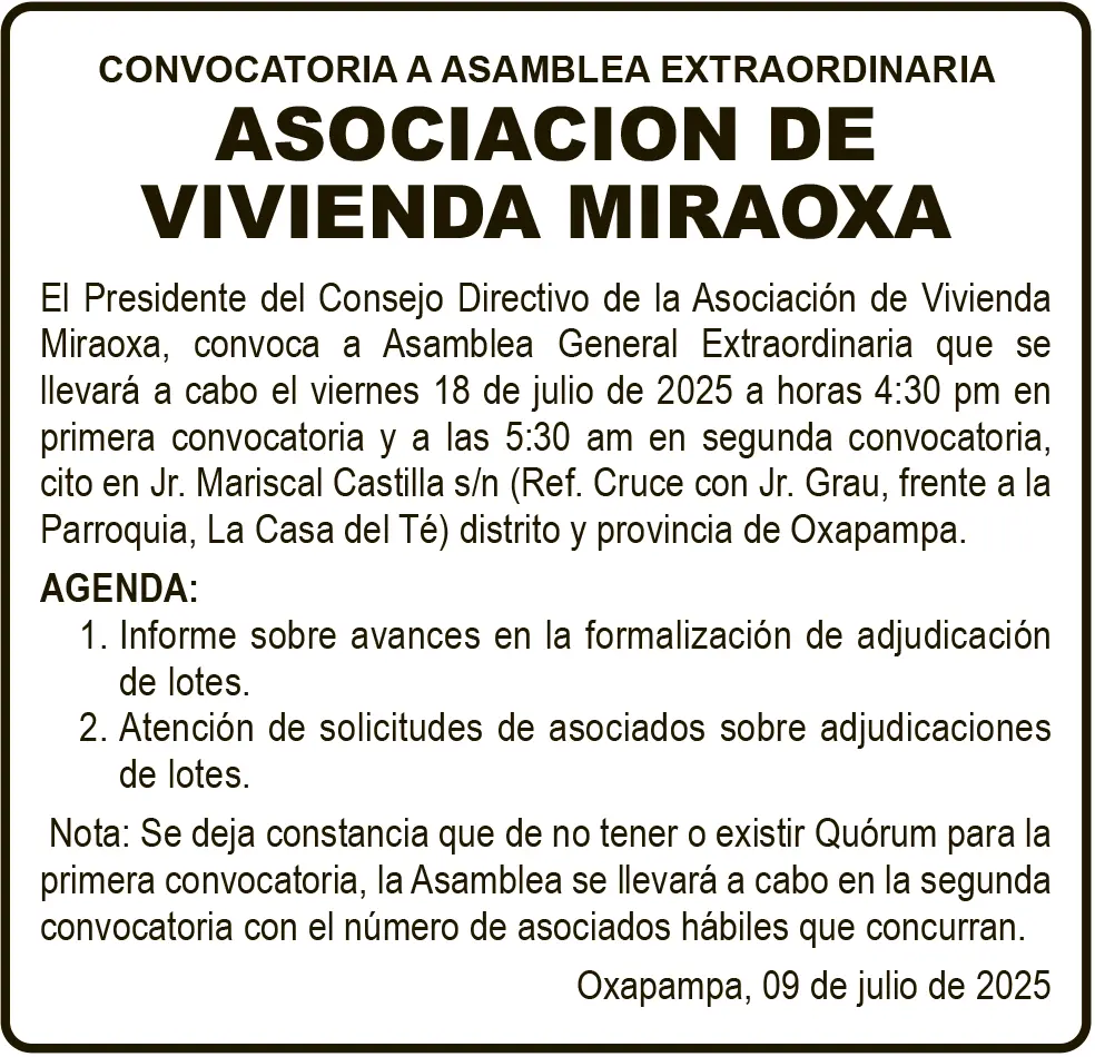 CONVOCATORIAS PASCO CONVOCATORIAS – SÁBADO 12/JUL/2025 12 de julio de 2025 CONVOCATORIA A ASAMBLEA EXTRAORDINARIAASOCIACIÓN DE VIVIENDA MIRAOXAPost navigationAnterior EN SECCLLA: NIÑOS CLAMAN AYUDA PARA ENFRENTAR EL FRÍOPróximo SANEAMIENTO FÍSICO LEGAL – SÁBADO 12/JUL/2025