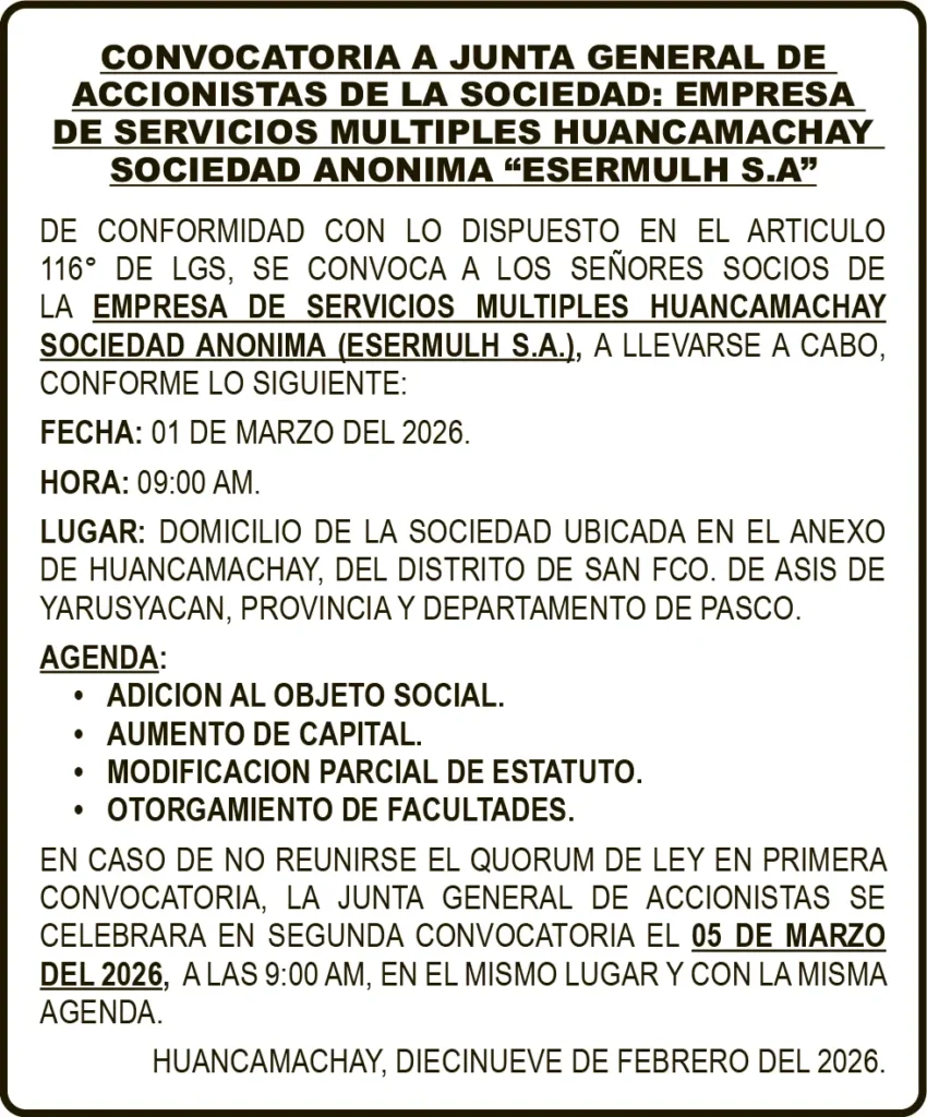 CONVOCATORIAS PASCO CONVOCATORIAS – VIERNES 20/FEB/2025 viernes, 20 de febrero de 2026 | 6:02 AM CONVOCATORIAJUNTA GENERAL DE ACCIONISTAS DE LA SOCIEDADEMPRESA DE SERVICIOS MULTIPLES HUANCAMACHAY SOCIEDAD ANONIMAESERMULH S.A.Post navigationAnterior HUANCAVELICA: POLICÍA RESCATA A CAN ATRAPADO EN RÍO ICHUPróximo ANP HUÁNUCO CON LOCAL INSTITUCIONAL PARA RECEPCIONAR QUEJAS