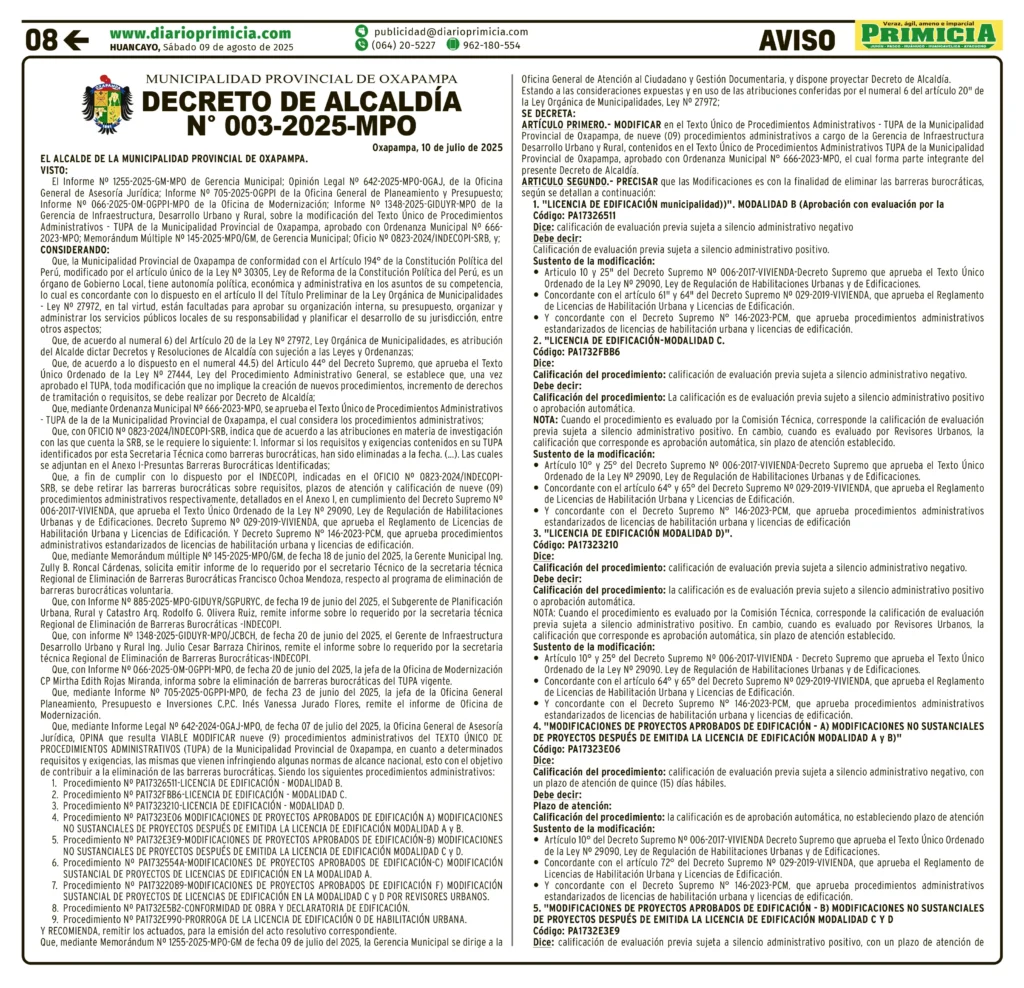 RESOLUCIÓN / ACUERDO / DECRETO MUNICIPAL DECRETO DE ALCALDÍA – SÁBADO 09/AGO/2025 sábado, 9 de agosto de 2025 | 1:49 AM MUNICIPALIDAD PROVINCIAL DE OXAPAMPADECRETO DE ALCALDÍA N° 003-2025-MPONavegación de entradasAnterior RECTIFICACIÓN DE PARTIDA – SÁBADO 09/AGO/2025Siguiente EDICTO MATRIMONIAL – SÁBADO 09/AGO/2025