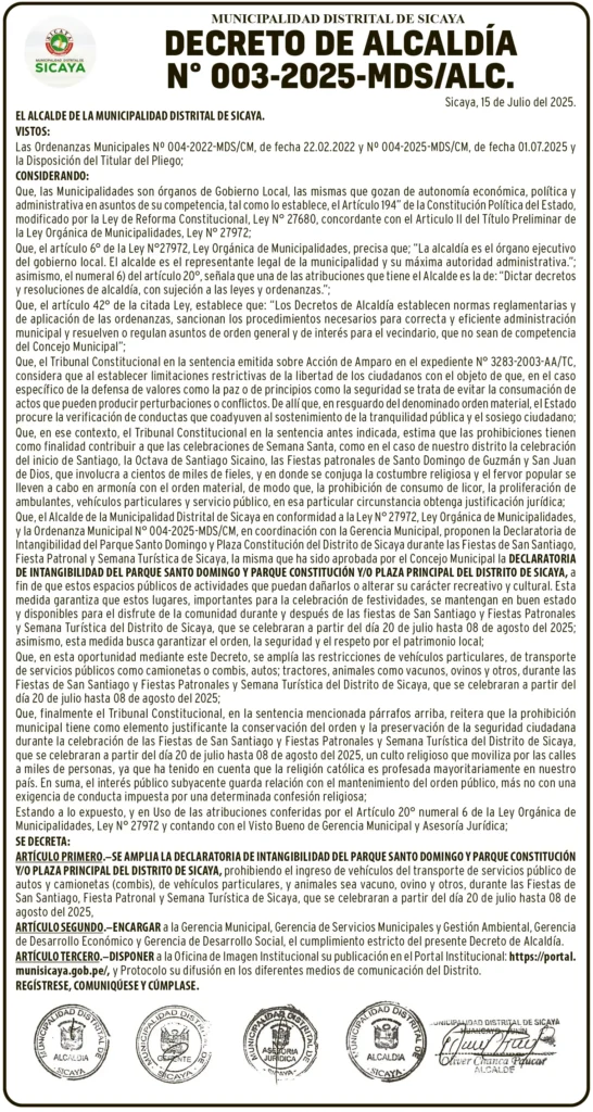 RESOLUCIÓN / ACUERDO / DECRETO MUNICIPAL DECRETO DE ALCALDÍA – VIERNES 25/JUL/2025 25 de julio de 2025 MUNICIPALIDAD DISTRITAL DE SICAYADECRETO DE ALCALDÍA N° 003-2025-MDS/ALCPost navigationAnterior ORDENANZA MUNICIPAL – VIERNES 25/JUL/2025Próximo COPA PERÚ DEPARTAMENTAL: CLASIFICAN SUMAR MOTORS, CHANCHAMAYO Y C.E.S.A.