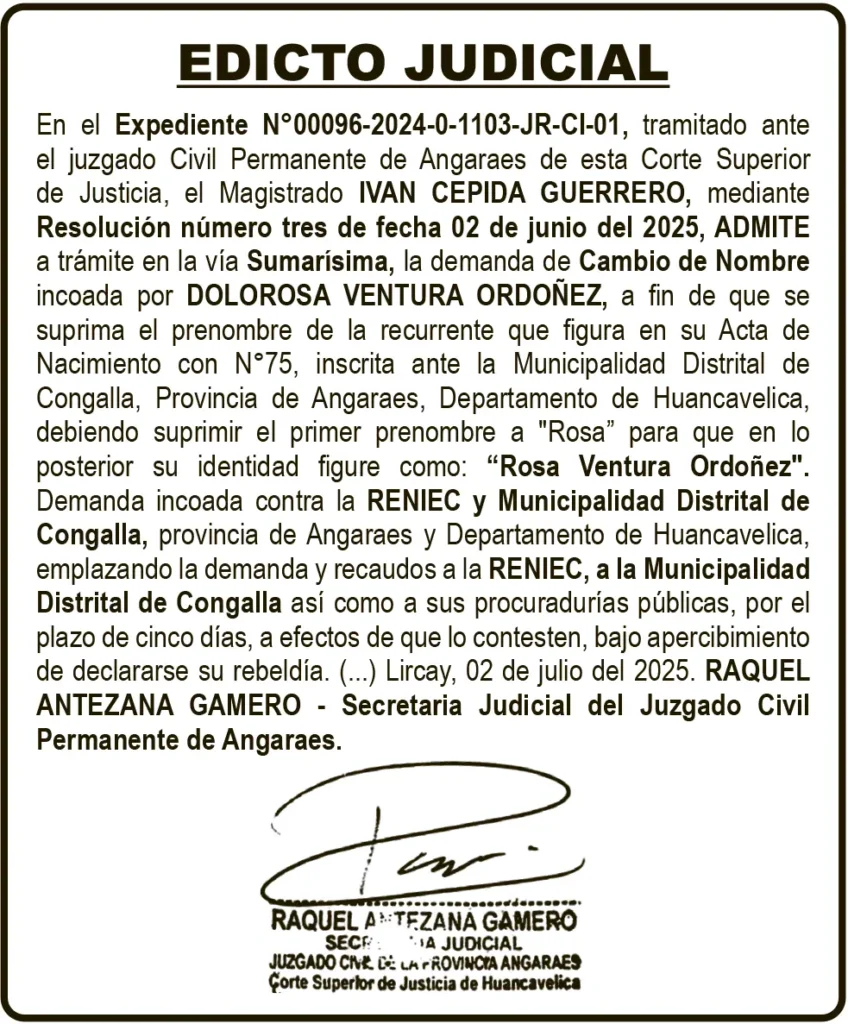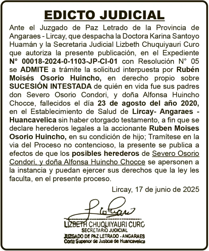 EDICTO JUDICIAL HUANCAVELICA – JUEVES 03/JUL/2025