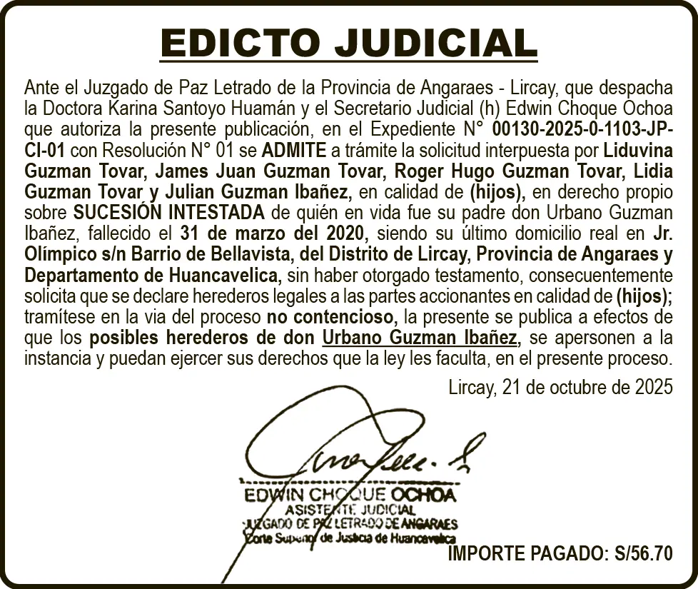 EDICTO JUDICIAL - HUANCAVELICA EDICTO JUDICIAL HUANCAVELICA – JUEVES 23/OCT/2025 1 min read 23 de octubre de 2025 EDICTO JUDICIALJUZGADO DE PAZ LETRADO DE LA PROVINCIA DE ANGARAES – LIRCAYEXPEDIENTE N° 00130-2025-0-1103-JP-CI-01SUCESIÓN INTESTADAContinue ReadingPrevious EDICTO MATRIMONIAL – JUEVES 23/OCT/2025Next PETITORIO MINERO HUANCAVELICA – JUEVES 23/OCT/2025