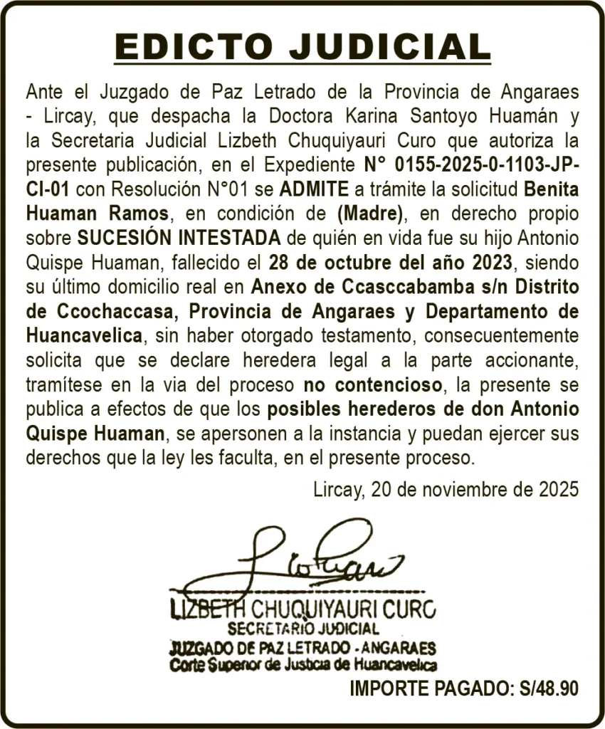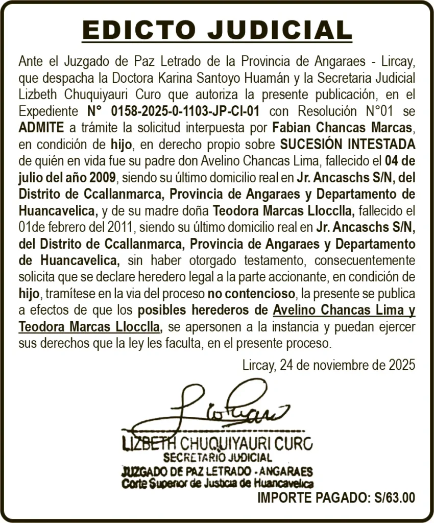 EDICTO JUDICIAL HUANCAVELICA – JUEVES 27/NOV/2025