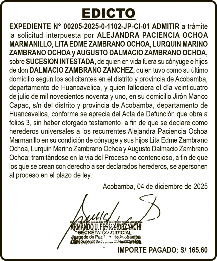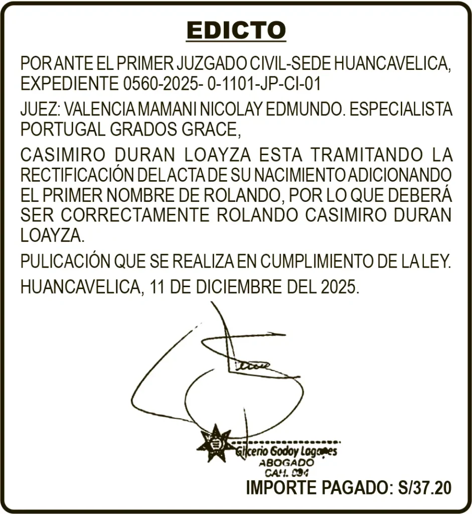 EDICTO JUDICIAL HUANCAVELICA – LUNES 15/DIC/2025