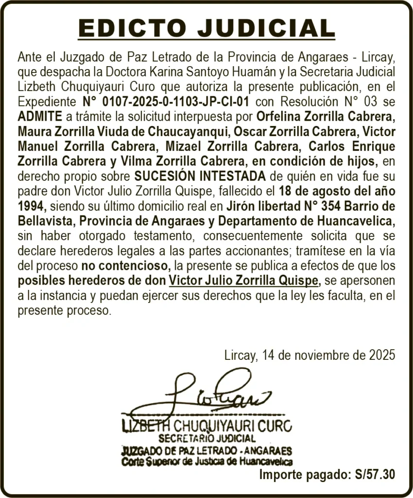 EDICTO JUDICIAL - HUANCAVELICA EDICTO JUDICIAL HUANCAVELICA – LUNES 17/NOV/2025 lunes, 17 de noviembre de 2025 | 1:48 AM EDICTO JUDICIALJUZGADO DE PAZ LETRADO DE LA PROVINCIA DE ANGARAES – LIRCAYEXPEDIENTE N° 0107-2025-0-1103-JP-CI-01SUCESIÓN INTESTADAPost navigationAnterior PUBLICACIÓN JEE PASCO – LUNES 17/NOV/2025Próximo PETITORIO MINERO HUANCAVELICA – LUNES 17/NOV/2025