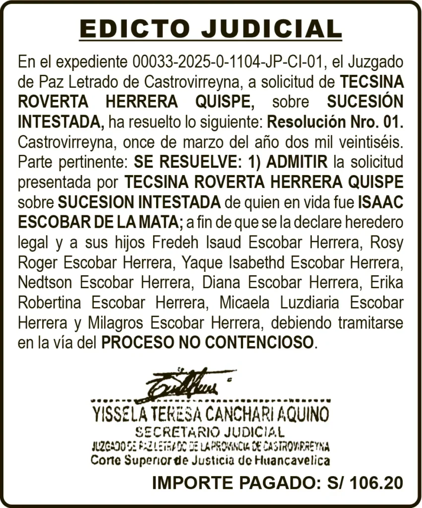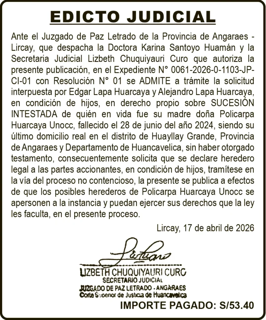 EDICTO JUDICIAL HUANCAVELICA – LUNES 27/ABR/2026