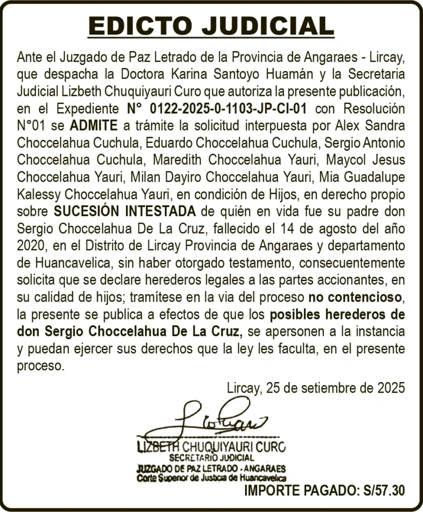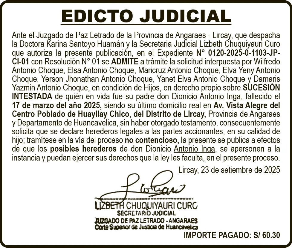 EDICTO JUDICIAL HUANCAVELICA – LUNES 29/SET/2025