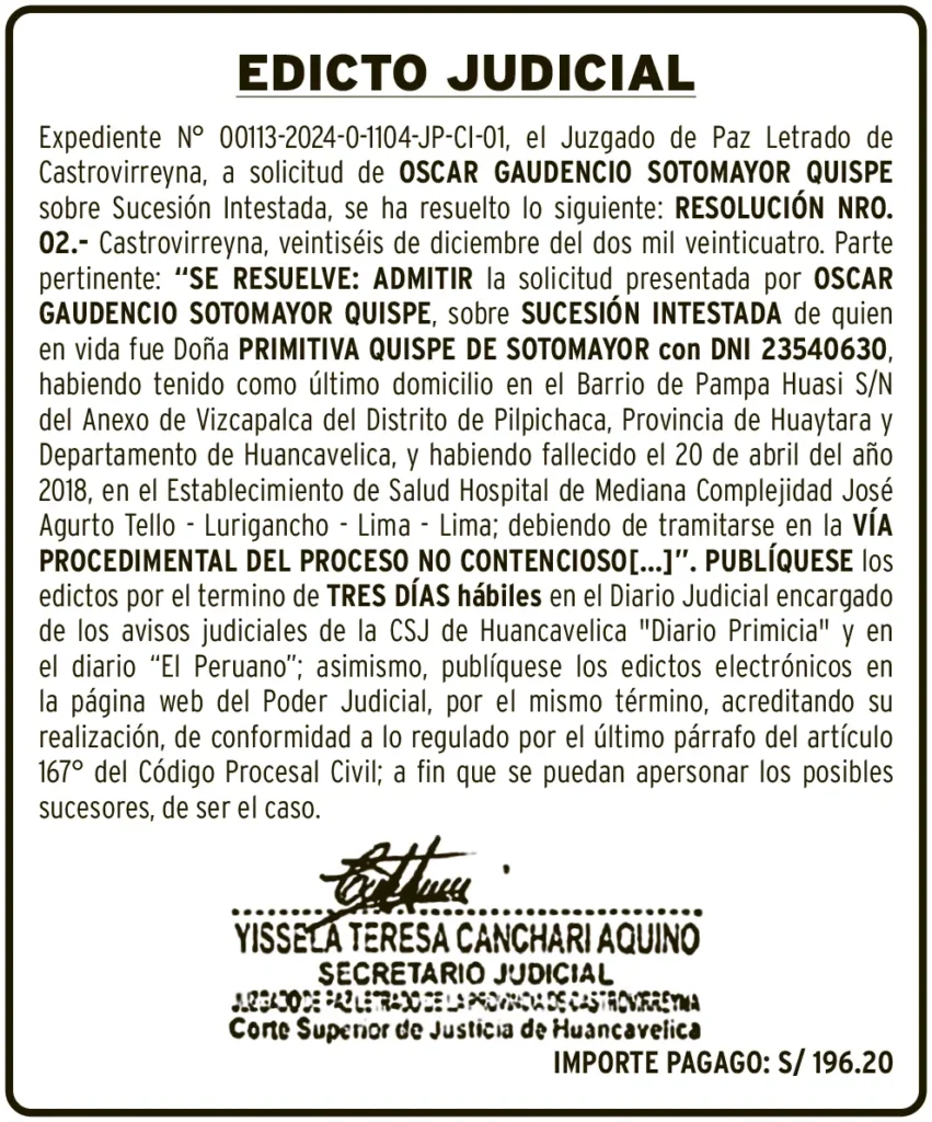 EDICTO JUDICIAL - HUANCAVELICA EDICTO JUDICIAL HUANCAVELICA – MARTES 20/MAY/2025 martes, 20 de mayo de 2025 | 1:44 AM EDICTO JUDICIALJUZGADO DE PAZ LETRADO DE CASTROVIRREYNAEXPEDIENTE N° 00113-2024-0-1104-JP-CI-01Navegación de entradasAnterior EDICTO JUDICIAL PASCO – MARTES 20/MAY/2025Siguiente PETITORIO MINERO HUANCAVELICA – MARTES 20/MAY/2025