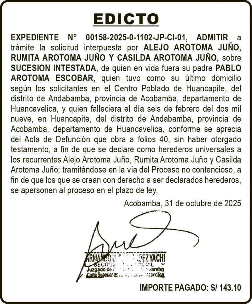 EDICTO JUDICIAL - HUANCAVELICA EDICTO JUDICIAL HUANCAVELICA – MARTES 25/NOV/2025 25 de noviembre de 2025 EDICTOEXPEDIENTE N° 00158-2025-0-1102-JP-CI-01SUCESIÓN INTESTADAPost navigationAnterior CONVOCATORIAS – MARTES 25/NOV/2025Próximo PETITORIO MINERO HUANCAVELICA – MARTES 25/NOV/2025