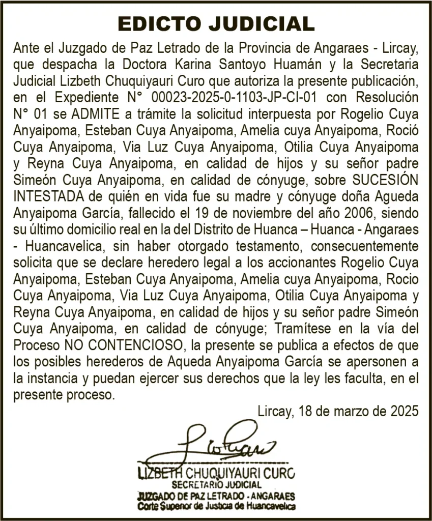 EDICTO JUDICIAL - HUANCAVELICA EDICTO JUDICIAL HUANCAVELICA – VIERNES 21/MAR/2025 21 de marzo de 2025 EDICTO JUDICIALJUZGADO DE PAZ LETRADO DE LA PROVINCIA DE ANGARAES – LIRCAYEXPEDIENTE N° 00023-2025-0-1103-JP-CI-01Post navigationAnterior COMUNICADO – VIERNES 21/MAR/2025Próximo EDICTO MATRIMONIAL – VIERNES 21/MAR/2025