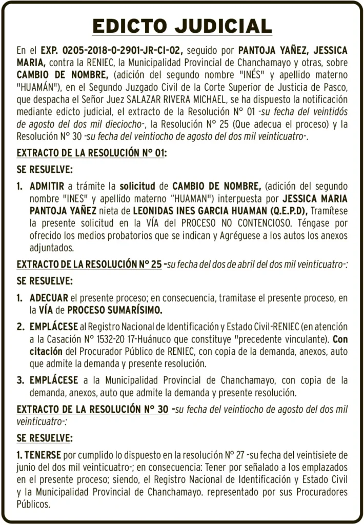 EDICTO JUDICIAL - PASCO EDICTO JUDICIAL PASCO – JUEVES 03/JUL/2025 3 de julio de 2025 EDICTO JUDICIALSEGUNDO JUZGADO CIVIL DE LA CORTE SUPERIOR DE JUSTICIA DE PASCOEXP. 0205-2018-0-2901-JR-CI-02Post navigationAnterior NOTIFICACIÓN POR EDICTO – JUEVES 03/JUL/2025Próximo EDICTO JUDICIAL HUANCAVELICA – JUEVES 03/JUL/2025