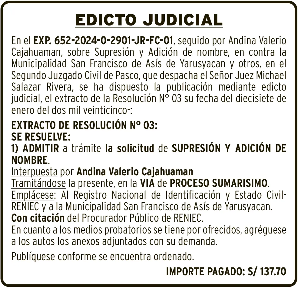 EDICTO JUDICIAL - PASCO EDICTO JUDICIAL PASCO – MARTES 20/MAY/2025 20 de mayo de 2025 EDICTO JUDICIALSEGUNDO JUZGADO CIVIL DE PASCOEXP. 652-2024-0-2901-JR-FC-01Post navigationAnterior HUANCAVELICA: PUENTE SINCHI ROCA SOPORTA EL DOBLE DE SU CAPACIDADPróximo EDICTO JUDICIAL HUANCAVELICA – MARTES 20/MAY/2025