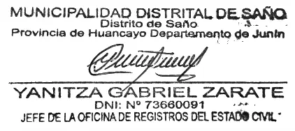 EL JEFE DE LA OFICINA DE REGISTROS DEL ESTADO CIVIL DE LA MUNICIPALIDAD DISTRITAL DE SAÑO, DE LA PROVINCIA DE HUANCAYO DEL DEPARTAMENTO DE JUNÍN, DE CONFORMIDAD CON LO DISPUESTO EN EL ARTÍCULO 250° DEL CÓDIGO CIVIL, HACE SABER QUE, DON; OSCAR LIZARDO CCENTE QUISPE, IDENTIFICADO CON DNI N° 44837960 DE 37 AÑOS DE EDAD, DE NACIONALIDAD PERUANO, NATURAL DEL DISTRITO DE SAÑO, PROVINCIA DE HUANCAYO, DEPARTAMENTO DE JUNÍN, DE OCUPACIÓN OBRERO MINERO, ESTADO CIVIL SOLTERO, CON DOMICILIO ACTUAL EN CA. MARCOS URIBE S/N DEL DISTRITO DE SAÑO, PROVINCIA DE HUANCAYO, DEPARTAMENTO DE JUNÍN; Y DOÑA; ROSMERY CABRERA LAPA, IDENTIFICADA CON DNI N° 47283300 DE 34 AÑOS DE EDAD, DE NACIONALIDAD PERUANA, NATURAL DEL DISTRITO DE MOYA, PROVINCIA DE HUANCAVELICA, DEPARTAMENTO DE HUANCAVELICA, DE OCUPACIÓN DOCENTE, ESTADO CIVIL SOLTERA, CON DOMICILIO ACTUAL EN CA. MARCOS URIBE S/N DEL DISTRITO DE SAÑO, PROVINCIA DE HUANCAYO, DEPARTAMENTO DE JUNÍN. PRETENDEN CONTRAER MATRIMONIO CIVIL EN ESTA MUNICIPALIDAD, EL DÍA 19 DE DICIEMBRE DEL 2025, A HORAS 03:00 P.M., EN EL AUDITORIO DE LA MUNICIPALIDAD DISTRITAL DE SAÑO DEL DISTRITO DE SAÑO, PROVINCIA DE HUANCAYO, DEPARTAMENTO DE JUNÍN. LAS PERSONAS QUE CONOZCAN CAUSALES DE IMPEDIMENTO PODRÁN DENUNCIARLAS DENTRO DEL TÉRMINO DE OCHO DÍAS HÁBILES Y EN FORMA PRESCRITA CONFORME AL ARTÍCULO 253 DEL CÓDIGO CIVIL, PRESENTARAN POR LA OFICINA DE MESA DE PARTES DE LA ENTIDAD.